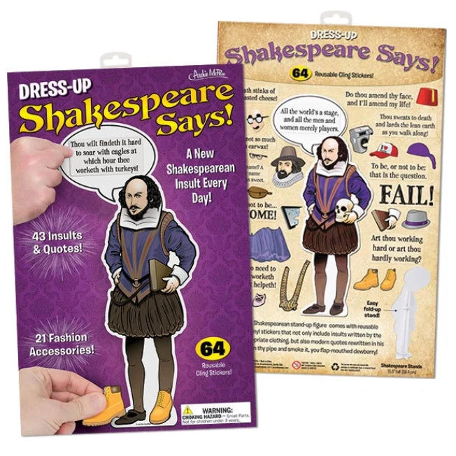 All your life, you’ve been forced to learn what Shakespeare said. Well, now you can make him say whatever you want! Our laminated cardboard Dress-Up Shakespeare Says! has a word balloon that you can fill with any of the included 43 reusable Shakespearean insults and quotes. You can even make some “interesting” wardrobe changes for old Bill with the included 21 reusable vinyl cling pieces of clothing and accessories.