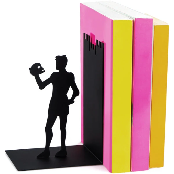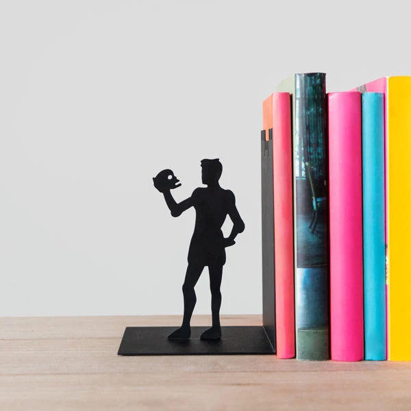 A slim black steel bookend featuring the Prince of Denmark in conversation with Yorick. One steel bookend.