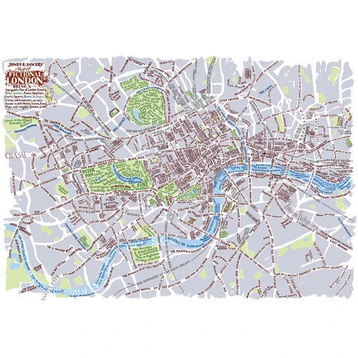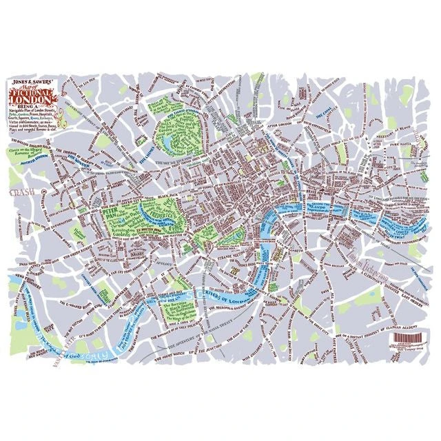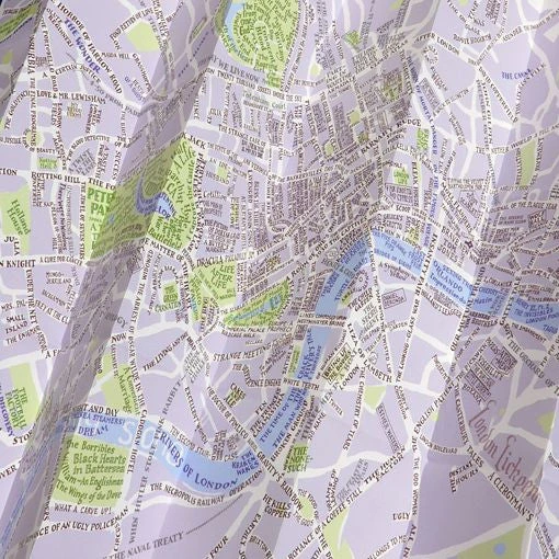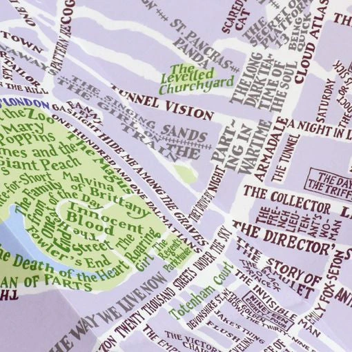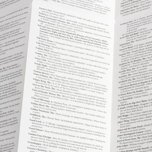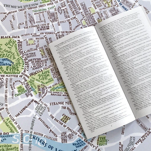 A navigable plan of London streets, parks, gardens, prisons, hospitals, courts, squares, rivers, railways, vistas and commutes; as mentioned in well over 600 novels, plays and poems. It features a huge range of genres and forms, and over 400 different authors including Angela Carter, Agatha Christie, Neil Gaiman, Shirley Conran, Douglas Adams, Charles Dickens, Lee Child, Iris Murdoch, Geoff Ryman and many many more. Available as a portable pocket-sized map for literary journeys around London, complete with a comprehensive and detailed index on the reverse, or a rolled poster with the index as a separate booklet.