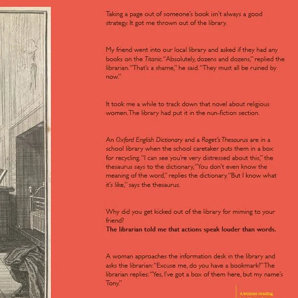The Book Lover’s Joke Book includes a huge range of comic material concentrating exclusively on the themes of books, reading, libraries, bookshops, and the literary life. As well as one-liners, puns, knock-knock jokes, and shaggy dog stories, it features sections including gravestones, book titles, jokes in acknowledgements/ copyright/index pages, literary hoaxes, literary snark, and authors’ in-jokes in novels, as well as sections such as Charles Dickens’s humorous fake book decorations. It also features the favourite jokes of well-known writers, and a selection of literary cartoons.