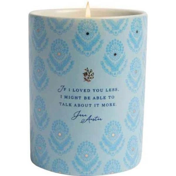 A beautiful citrus and blossom-scented candle featuring the following quotation from Emma: ‘If I loved you less, I might be able to talk about it more’. This hand-poured candle is filled with the finest ingredients of soy and coco wax, which provides an even, clean 50-hour burn and lovely aroma flow. The perfect gift for any Austen fan.