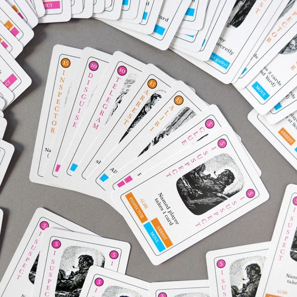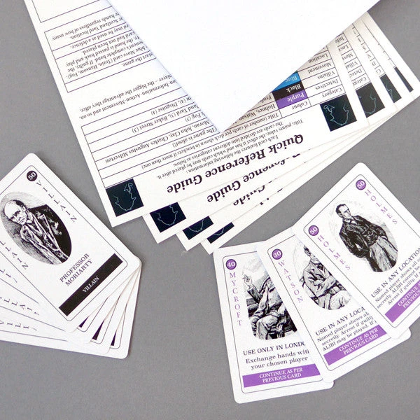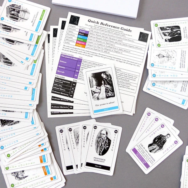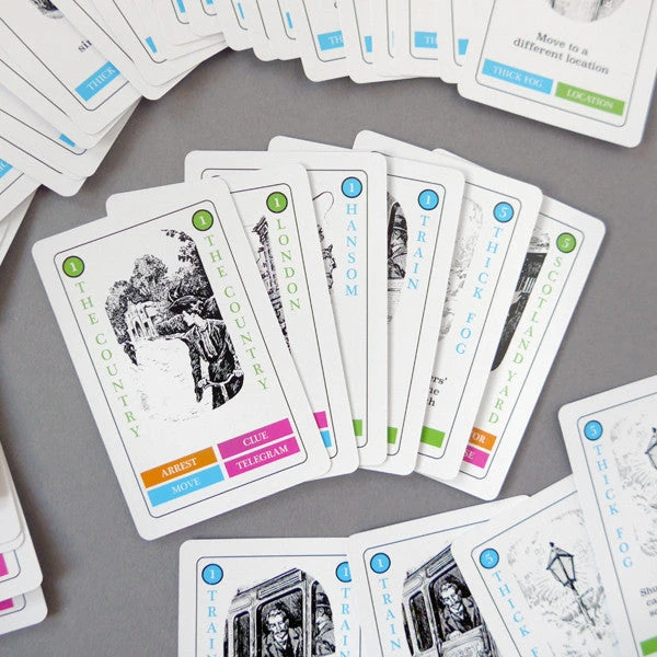 The game’s afoot! In this excellent card game, a unique Holmesian situation is created by shuffling cards representing villains, locations, chances of arrest, and more; the players’ many choices (and fate) result in an arrest or an escape!