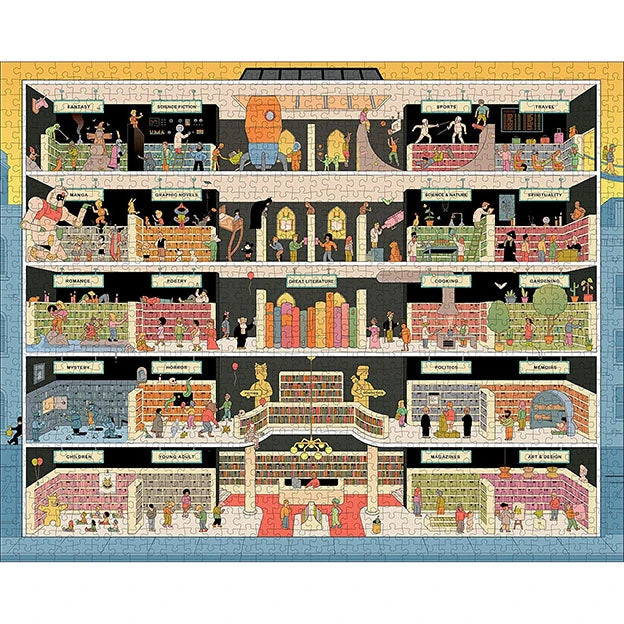 In the Bookstore is a bibliophile’s dream puzzle: a multi-room bookstore filled with readers, each room an ode to a specific literary genre: fiction, poetry, design, mystery, graphic novels and more.