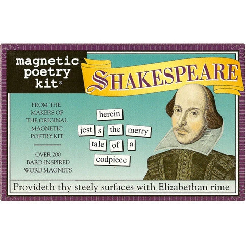 Break into spontaneous verse and wax witty upon thy steely surfaces with this saucy collection of bard-inspired word tiles drawn from the works of Shakespeare, including bawdy, wicked, haste, love, mortal, wherefore and maiden.