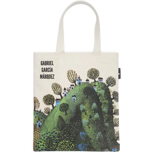 A double sided tote bag featuring artwork from an edition of One Hundred Years of Solitude. A strong cotton canvas bag hand-screen-printed with coloured ink.