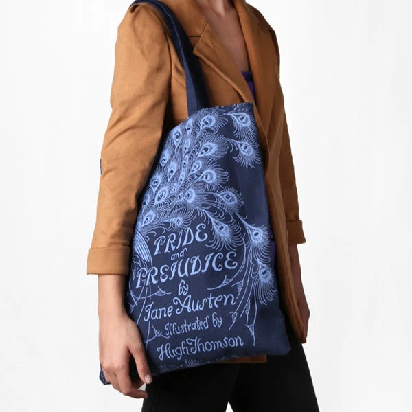 The splendiferous plumage of a proud peacock adorns this lovely bag. The image is taken from Hugh Thomson’s cover design for the Jane Austen classic. A strong cotton canvas bag hand-screen-printed with black and blue ink.