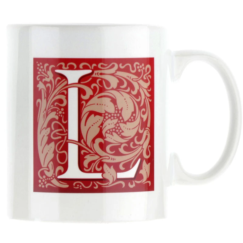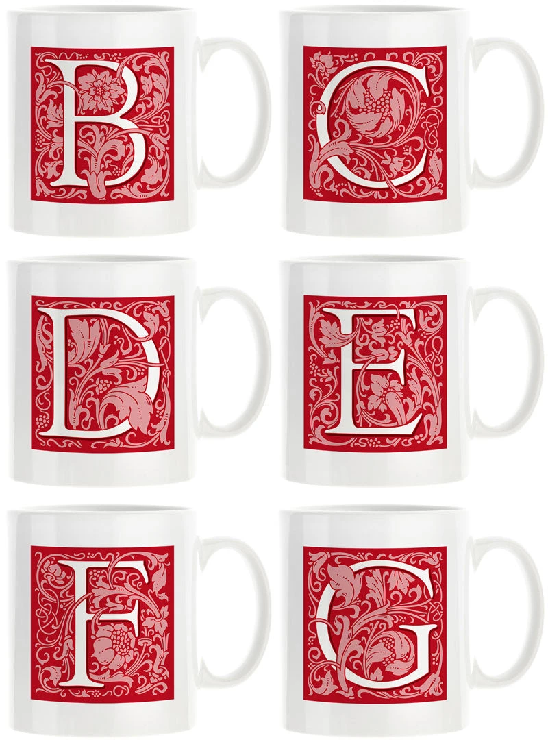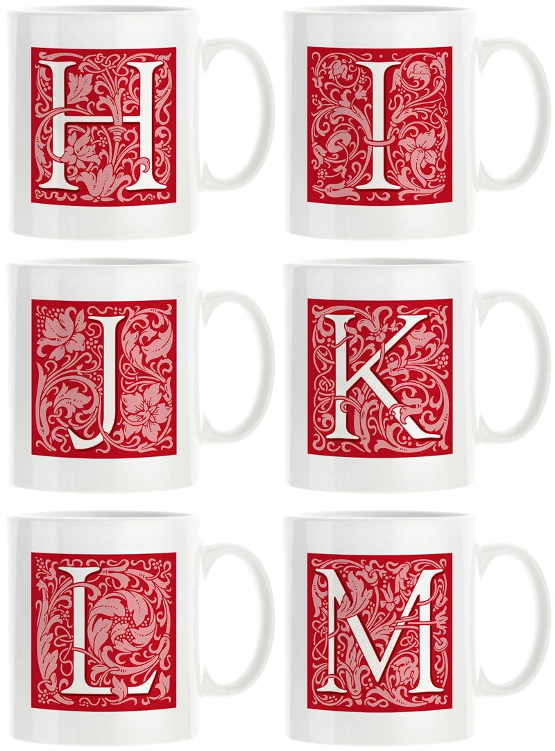 A mug with your choice of letter, in the style of the decorated initials at the beginning of chapters in books from the medieval era up until the twentieth century.