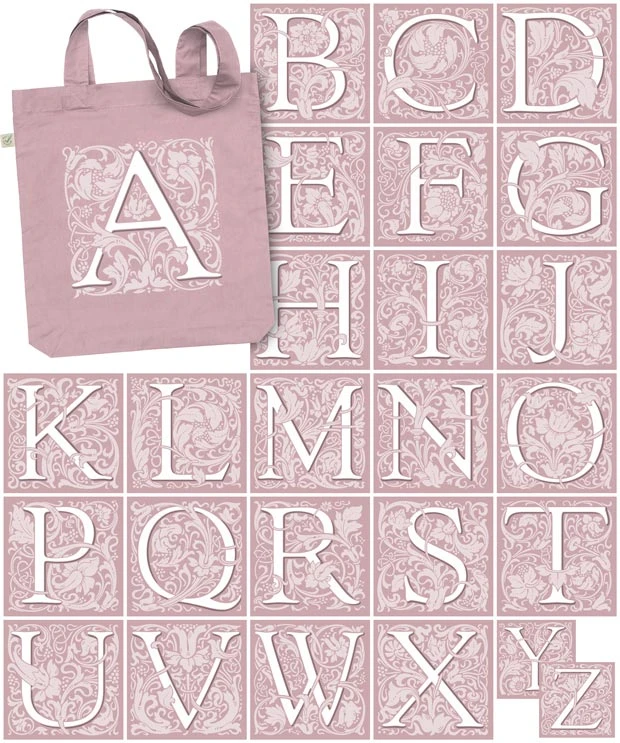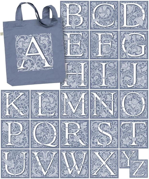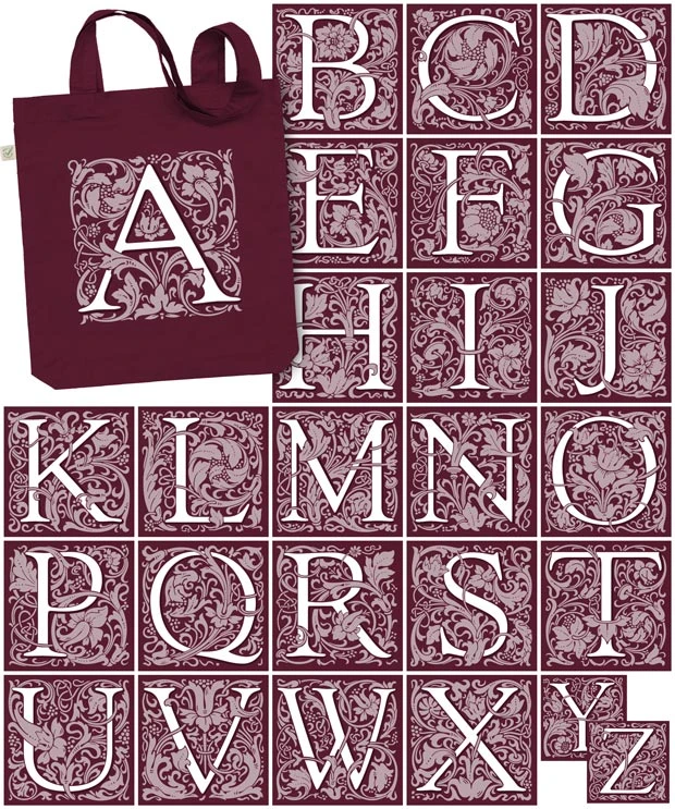 Your choice of initial letter printed on a tote bag. Five colours of tote to choose from. These initials are also available on cushion covers, mugs and notebooks.