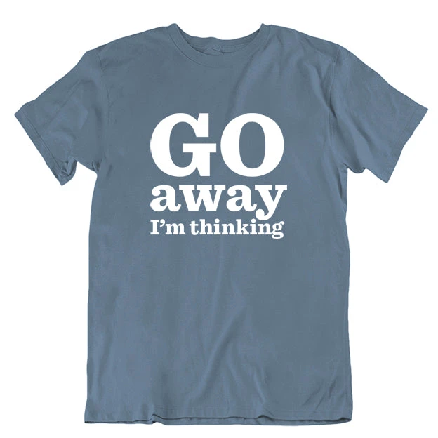 - Indigo blue t-shirt printed with pale grey ink.