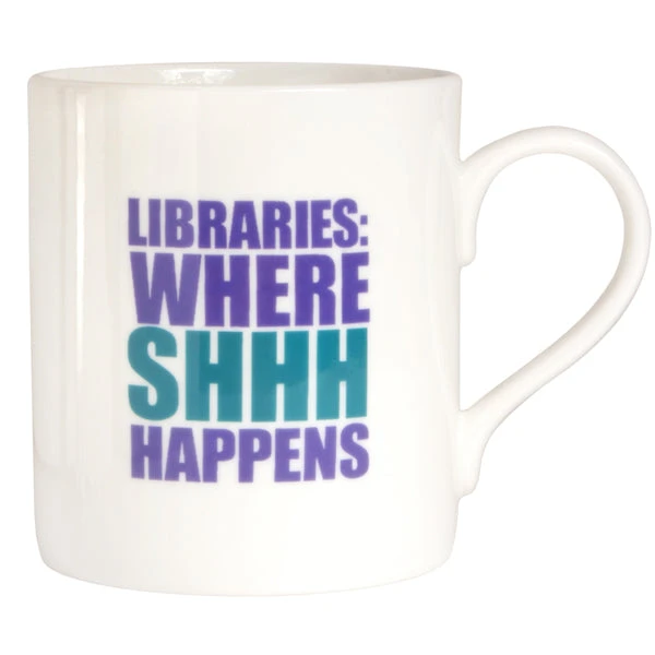 The perfect mug for librarians: we tried to do a mug which said “Go away I’m cataloguing, and helping children, and shelving, and being nice to borrowers…” but we couldn’t fit it all on. Bone china mug printed in purple and teal. Quotation appears on both sides of the mug.