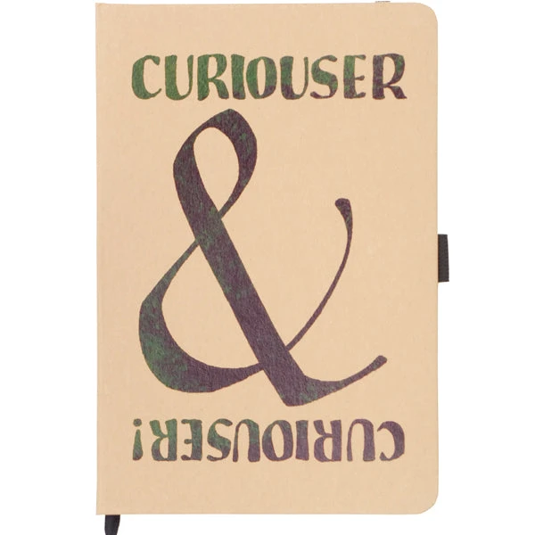 The cover of this notebook shows a quotation from Lewis Carroll’s ‘Alice’s Adventures in Wonderland’, hand-lettered and creatively coloured. Featuring an elasticated pen holder at the side, a ribbon pager marker, and a handy elastic closure/page holder.