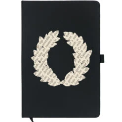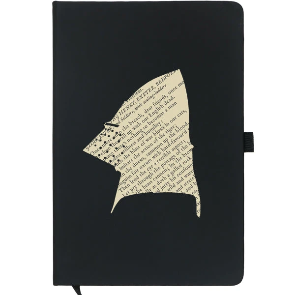 The cover of this notebook creatively combines the silhouette of a late 14th/early 15th-century helmet with the text of one of the most famous speeches on English literature. Once more into the breach! The notebook features an elasticated pen holder at the side, a ribbon pager marker, and a handy elastic closure/page holder.
