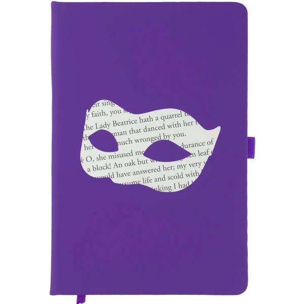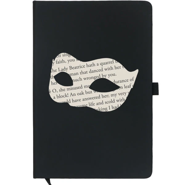 The cover of this notebook creatively combines a page and evocative image from the masked ball in Much Ado About Nothing. The notebook features an elasticated pen holder at the side, a ribbon pager marker, and a handy elastic closure/page holder.