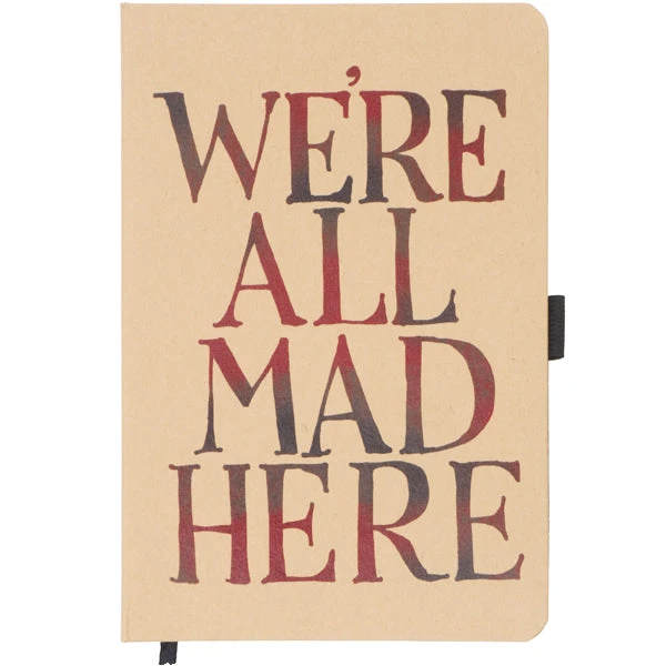 The cover of this notebook shows a quotation from Lewis Carroll’s ‘Alice’s Adventures in Wonderland’, hand-lettered and creatively coloured. Featuring an elasticated pen holder at the side, a ribbon pager marker, and a handy elastic closure/page holder.