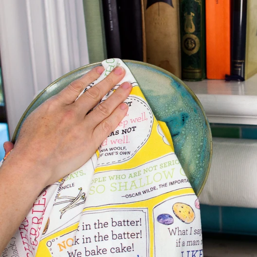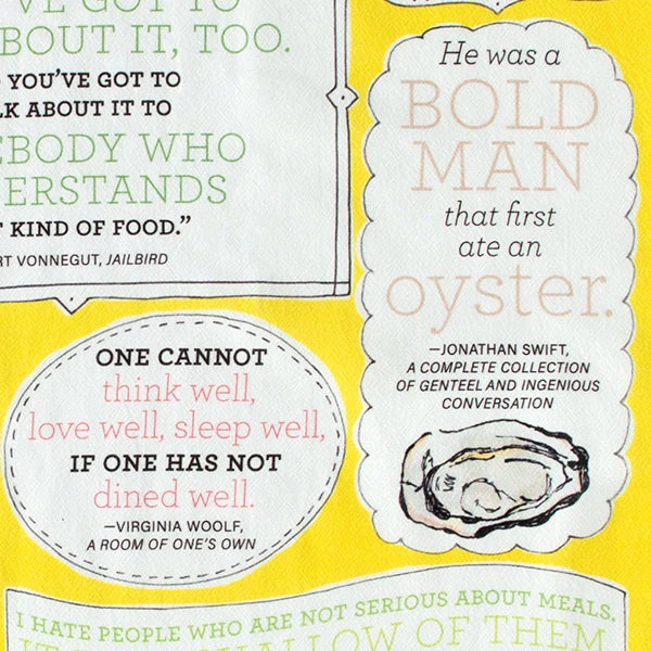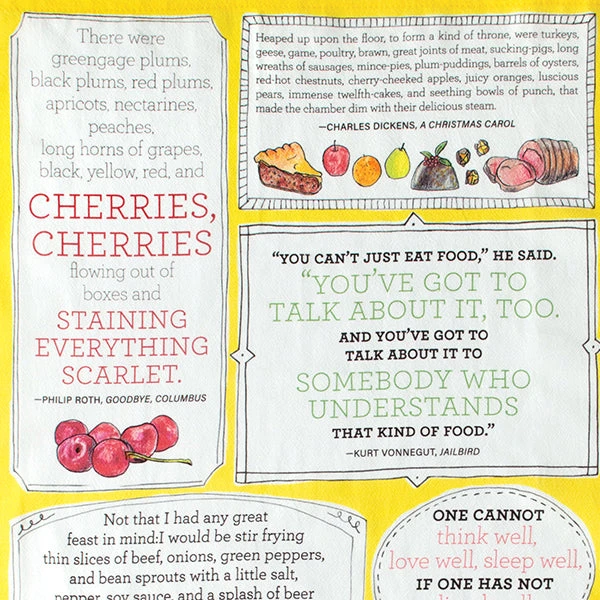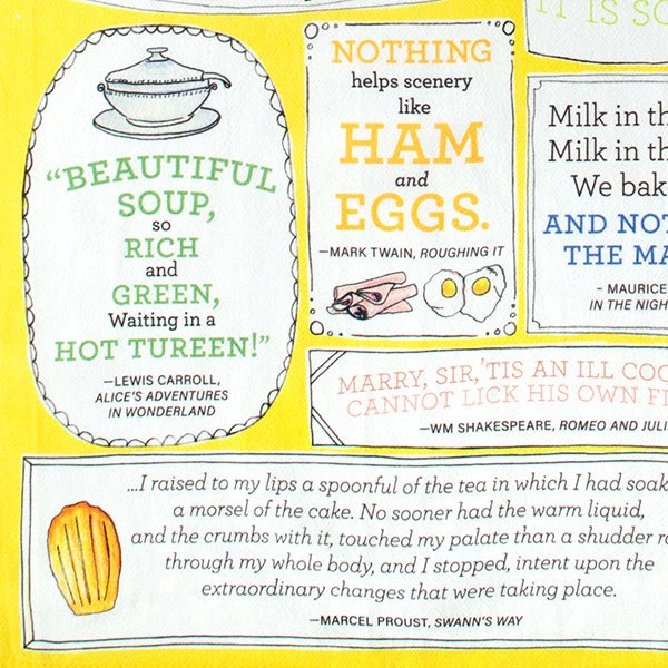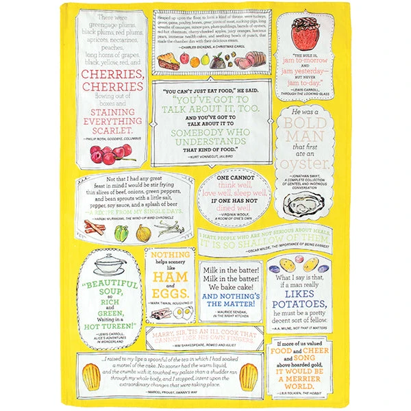 Cotton tea towel bearing eighteen culinary quotes from a variety of notable authors, including Carroll, Dickens, Shakespeare, Swift, Wilde and Woolf.